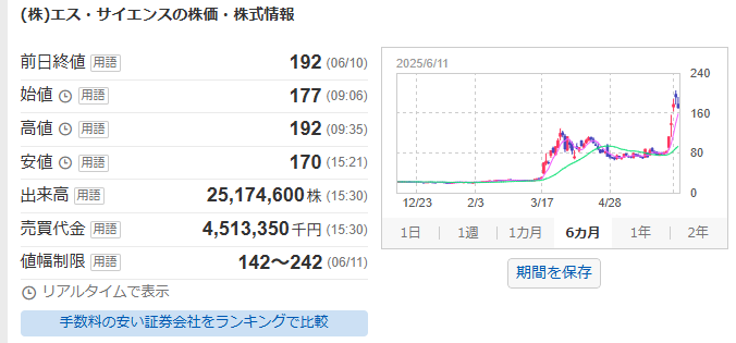 管理人コメント:エス・サイエンスの株価が爆上がりしていますね。管理人は手を出しませんが・・・